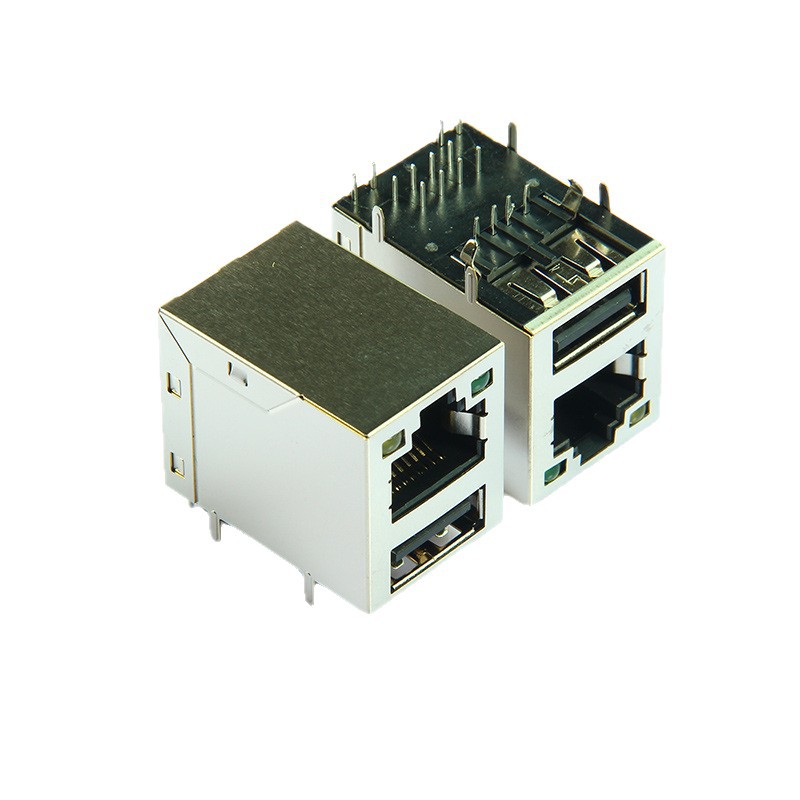 本款 RJ45+USB2.0 连体连接器,将以太网接口与 USB2.0 接口集成于一体,内置高性能网络变压器与滤波器,有效提升信号稳定性与抗干扰能力,广泛应用于各类需要同时具备网络与 USB 扩展功能的电子设备。
